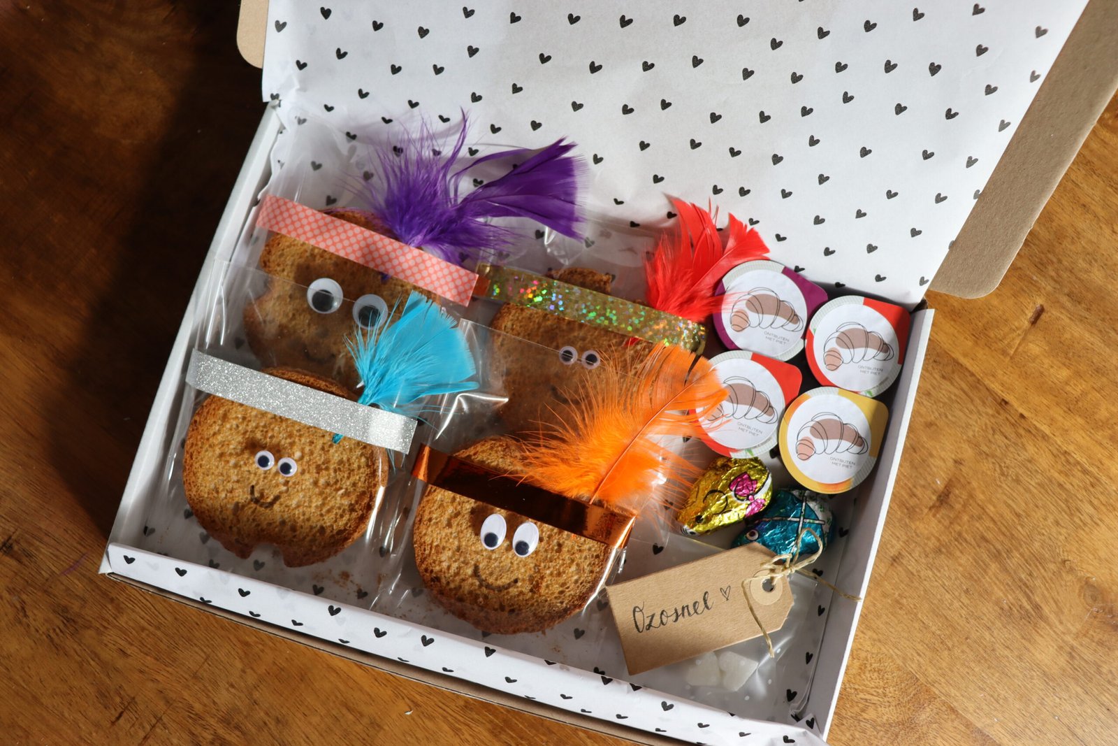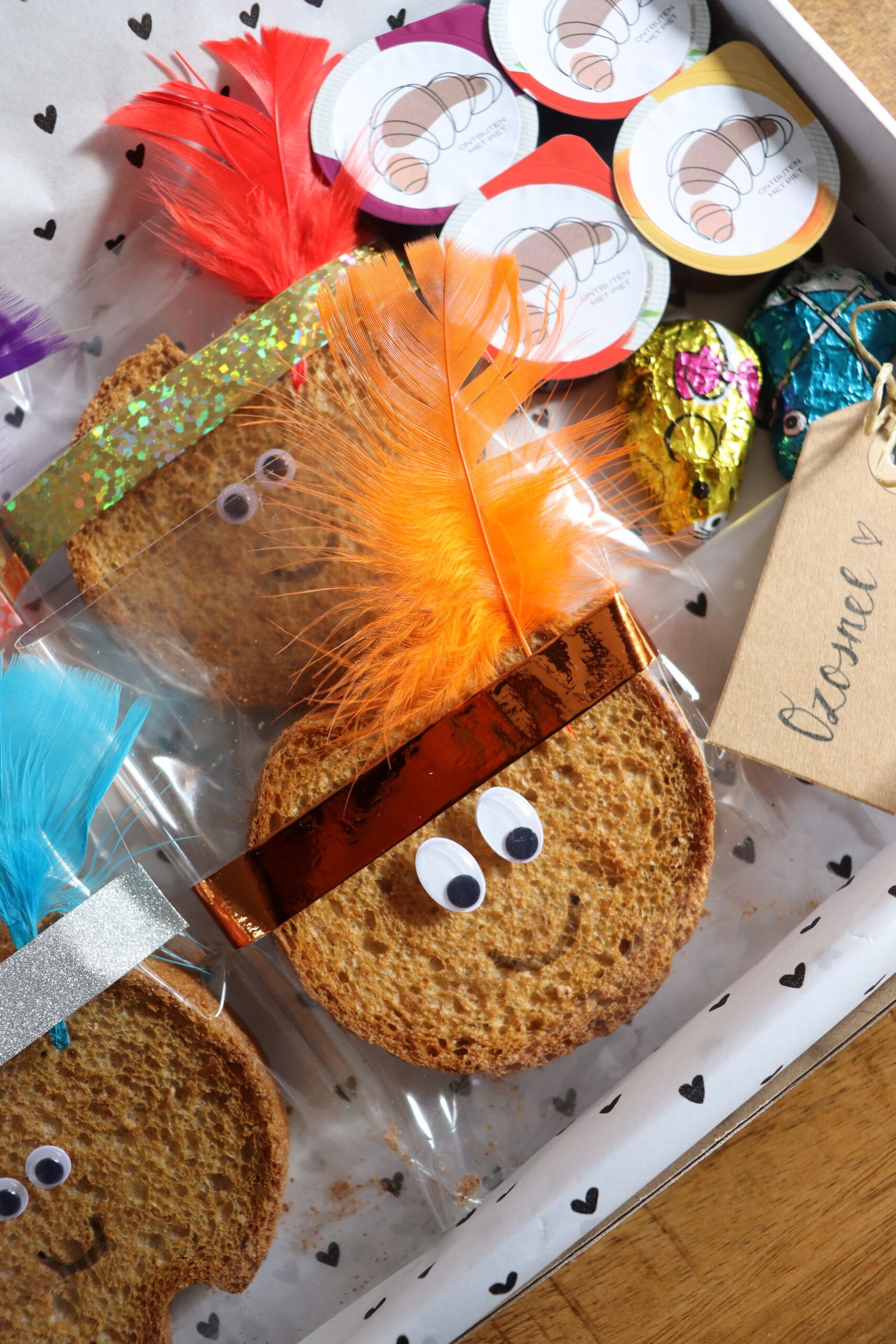 Hoe graag Ontbijtpiet het ook zou willen… Ze kan helaas niet bij iedereen persoonlijk langs. Wil jij toch een ontbijtje van de enige echte Ontbijtpiet, dat kan! Je bestelt de beschuitbox online, kiest een datum en je ontvangt jouw Pietenontbijtje door de brievenbus. Wat zit er dan in zo een beschuitbox? Vier Pieten-beschuitjes, vier kuipjes Ontbijtenpietenjam, wat lekkers voor jou én wat lekkers voor Ozosnel. Liever zelf bakken? Dan is de kruidnotenbox misschien meer iets voor jou!